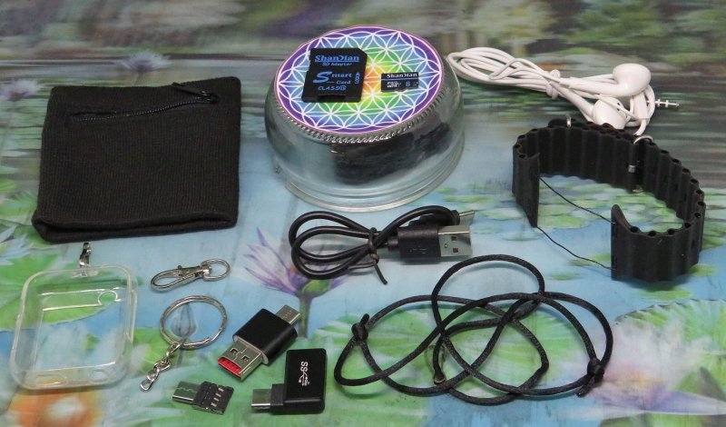 Foto: alle meegeleverde accessoires: o.a. siliconen hoes, horlogeband, polsband, glazen onderzetter, enz.