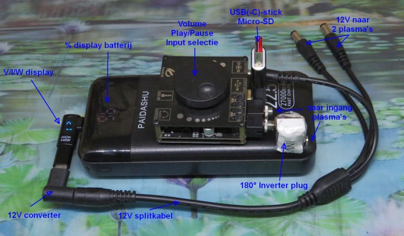 - Slechts 1 oplaadbare powerbank van 27000 mAh met PD 12V converter die zowel beide plasma's en de versterker van voeding voorziet